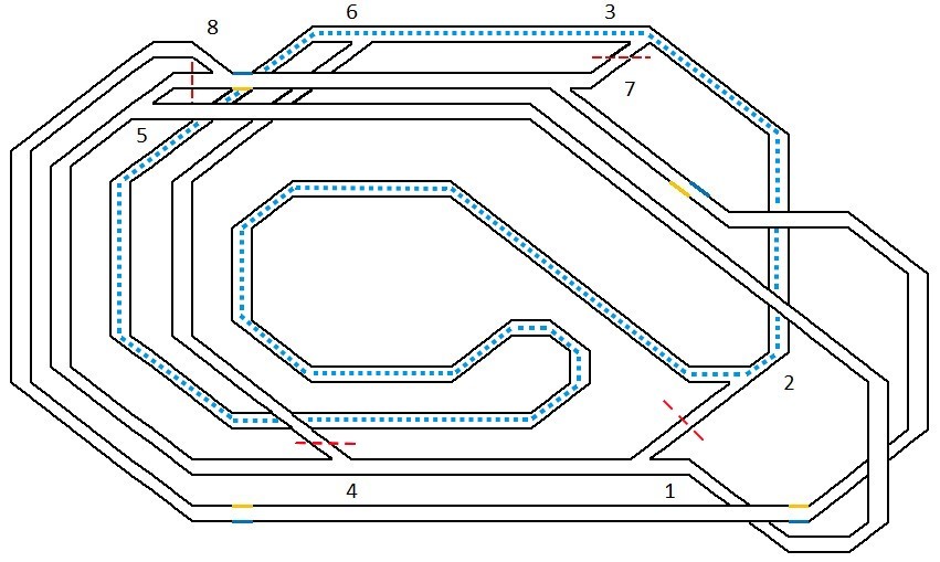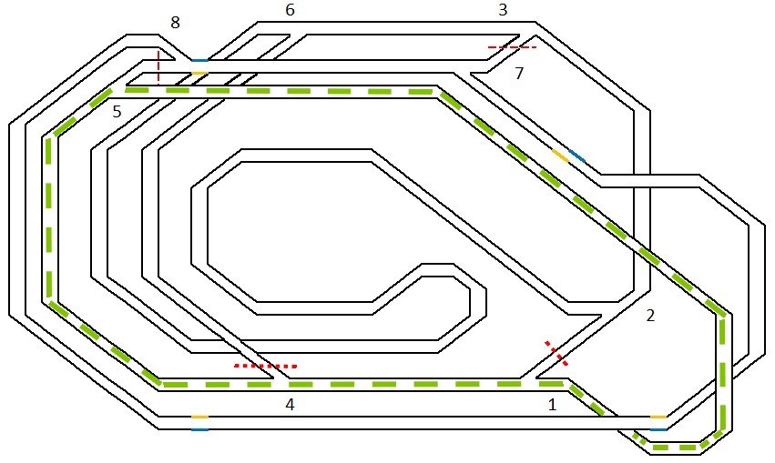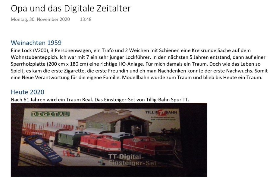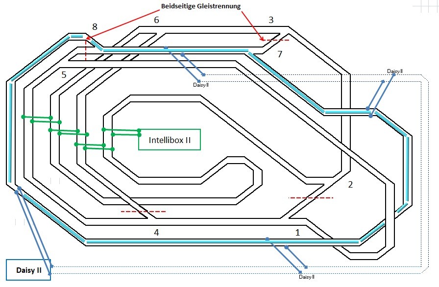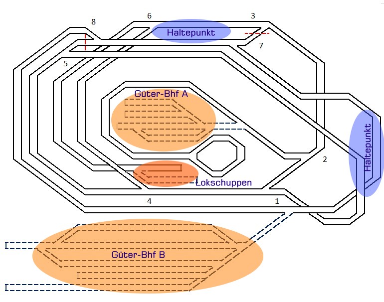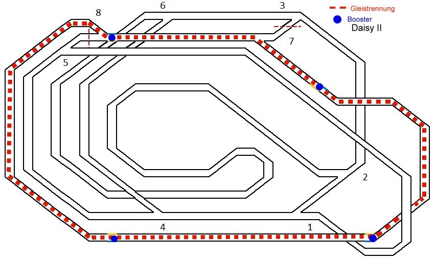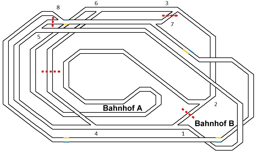 "Das ist doch ein schöner Ansatz. Jetzt musst du nur noch eine gedankliche Hürde schaffen, dann wird es gut: In der analogen Welt spielt man nebeneinander, jeder auf seinem Kreis. In der digitalen Welt hat man die Möglichkeit miteinander zu spielen und die Fesseln der Kreise zu sprengen. Das sieht man an deinem Gleisplan sehr schön. Mach aus den 3 Kreisen einen Kreis und eine Paradestrecke, dazu eine Nebenbahn mit Endbahnhof und um den Hauptkreis verteilt verschiedene kleine Güteranschlüsse. Wenn man das hat, bekommt jeder Mitspieler konkrete Aufgaben (z.B. bring den Güterwagen von A nach B oder fertige den Eilzug im Bahnhof ab). Das Spannende dabei: die Ressource Gleis muss von allen gemeinsam genutzt werden, d.h. jeder kann seine Aufgabe nur erfüllen, wenn er sich mit den anderen abstimmt und zusammen arbeitet."